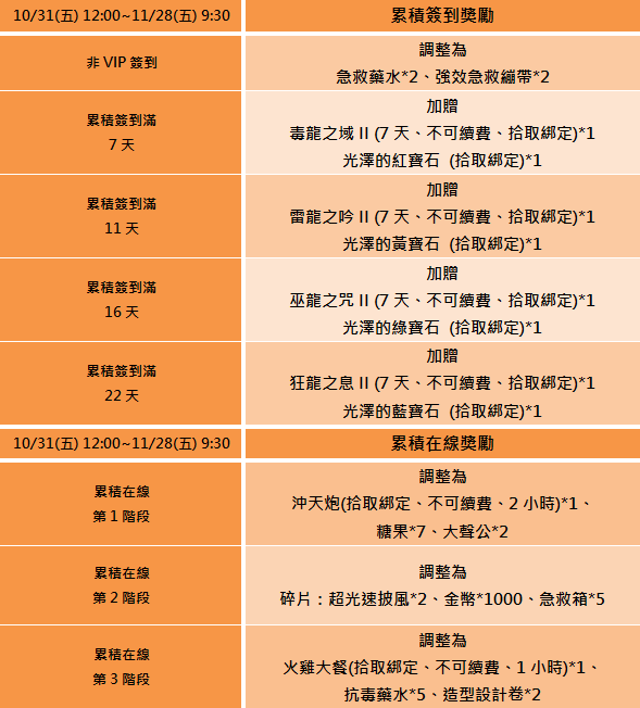 11月初冬拿好禮,活動在線第一階段送【沖天炮(2小時)】,第二階段送【碎片:超光速披風*2】喔,第三階段還有【火雞大餐(1小時)、造型設計卷*2】!