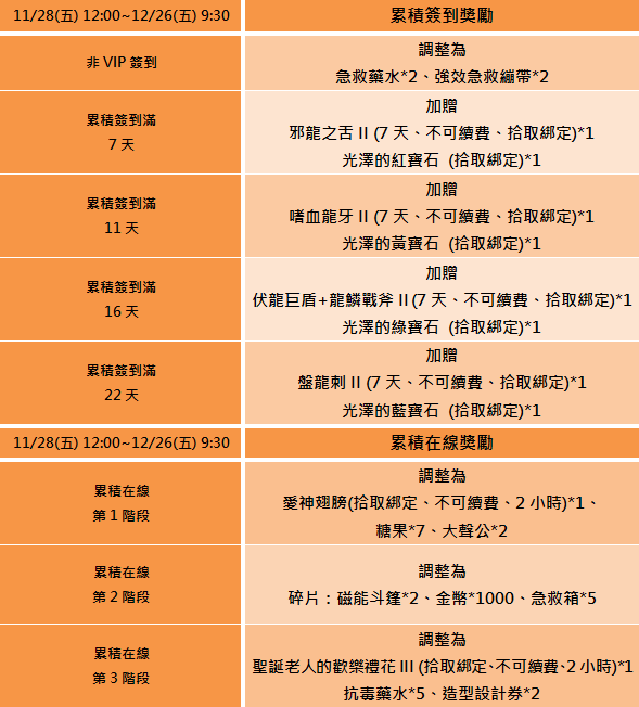 12月聖誕拿好禮,活動在線第一階段送【愛神翅膀(2小時)】,第二階段送【碎片:磁能斗篷*2】喔,第三階段還有【聖誕老人的歡樂禮花III (2小時)、造型設計券*2】!