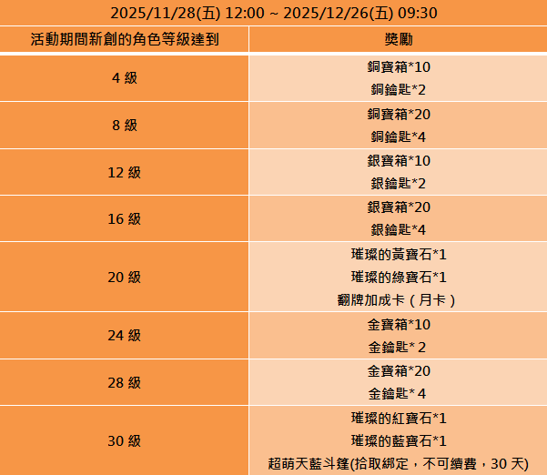 - 達成等級條件後,獎勵將立即透過遊戲內郵件寄送至角色信箱,請達成領獎條件的玩家留意遊戲信箱。