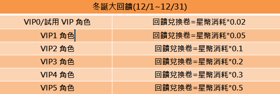 - 儲值獎勵回饋,活動期間的儲值星幣是以帳號計算,獎勵優先寄送給帳號中VIP最高的角色;若有兩隻以上角色VIP等級一致,則獎勵優先寄送給等級最高的角色;若有兩隻以上角色等級一致,獎勵則優先寄送給先創立的角色。