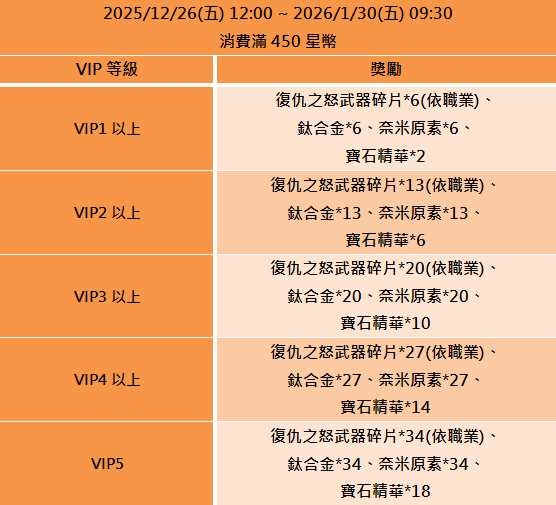 本月VIP角色“消費”滿450星幣,該消費星幣的角色就可以根據職業與VIP等級來獲得獎勵喔!