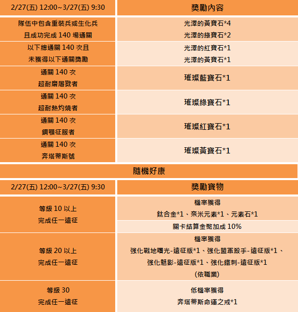 - 獎勵皆由遊戲內信件寄送,請有達成領獎條件的玩家留意遊戲信箱。